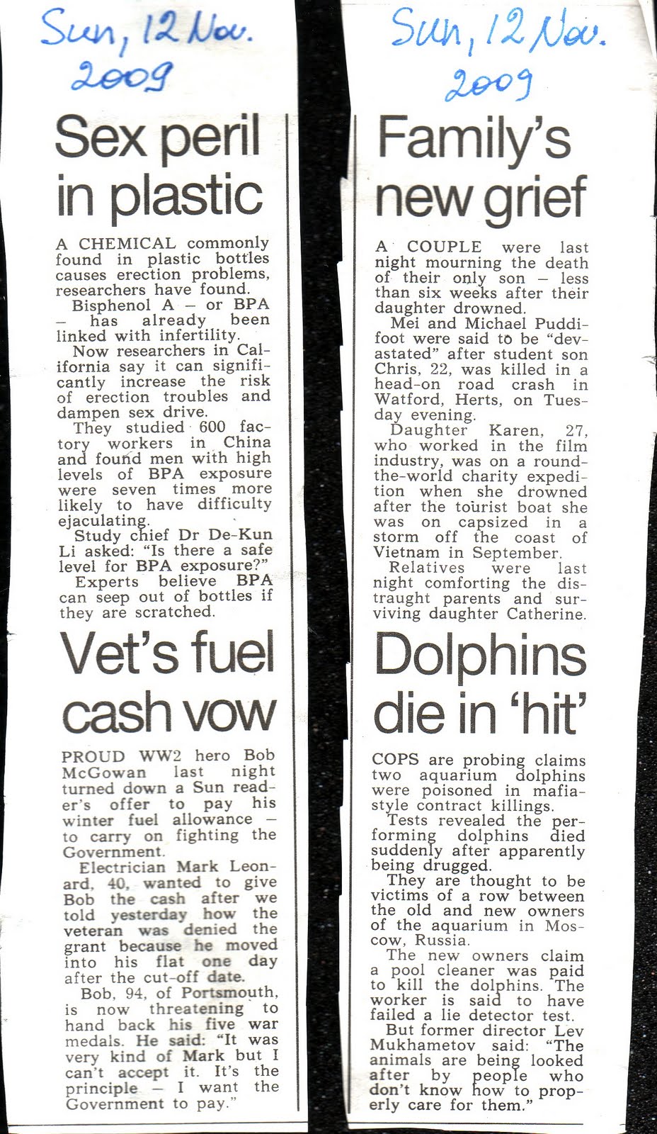 ( nr 238 ) Scans above: four news items from Sun of 12 Nov.2009 (Sex peril in plastic, Portsmouth veteran Bob McGowan, Family tragedy, Moscow Zoo), three articles from Mail on Sunday of 22 Nov.2009 ( Flu letters, Moon and epilepsy, Agnes Wong - the baby killer in hiding).